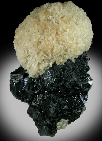 | Description: | Spherical cluster 6 cm diameter of yellowish-white barite crystals on matrix of lustrous, red- black sphalerite crystals. The sphalerite crystals are translucent when strongly illuminated. |