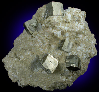 | Description: | Six cubic crystals of pyrite in crumbly clay matrix. |