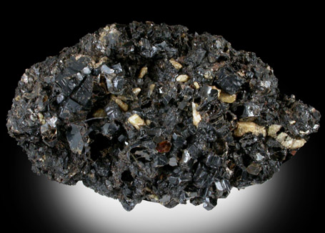 | Description: | Large plate of black biotite mica crystals up to 15 mm with yellow, six-sided crystals of apatite up to 10 mm mixed in. |