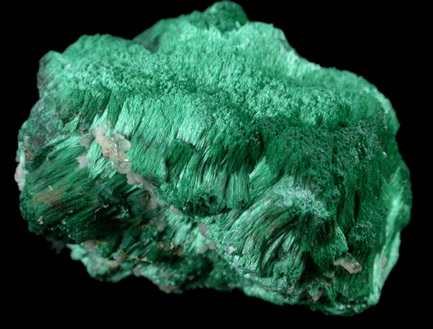 | Description: | Rectangular mass of fibrous, green malachite crystals (possibly a pseudomorph after a single azurite crystal). Looks beautiful under magnification. |