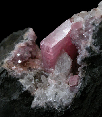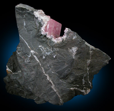 | Description: | Single crystal of pink rhodochrosite exposed in a cavity. Both sides of the cavity are open to the sides. The rhodochrosite is a thin, rhombic shape and fluoresces under UV illumination. Ex. John Rumble collection (South Africa) |