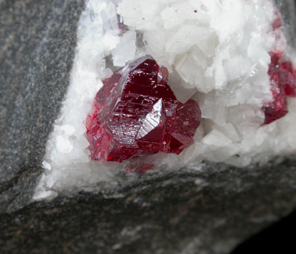 | Description: | Blood-red crystals of cinnabar in white calcite matrix. The cinnabar crystals are twinned and have striated surfaces. The back is sawn flat so the specimen sits upright without support. |