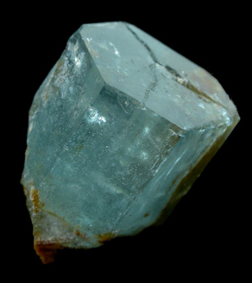 | Description: | Short crystal of aquamarine beryl with flat termination. An internal fracture along the right side is filled with brown limonite. No external damage. |