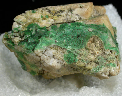 | Description: | Hemispherical crystals of green bayldonite in a band running across quartz matrix. Looks beautiful under magnification - thin crusts of translucent crystals. Mounted to styrofoam base and box. Ex. Robert Karr collection (California) |