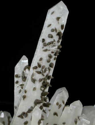 | Description: | Elongated crystals of milky quartz up to 5 cm long with scattered crystals of gray calcite up to 2 mm. Very aesthetic formation with little damage. Ex. L. Russianoff collection |