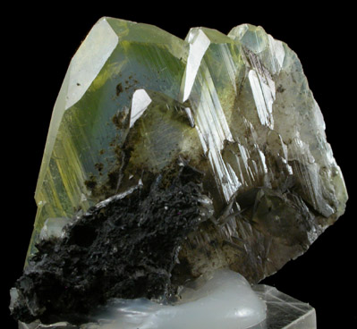 | Description: | Large crystal of transparent anglesite with color ranging from colorless to yellow at the edges. Externally in good condition, except for a small nick on one edge. Internally flawless, except for an internal fracture near the termination. Mounted to base |