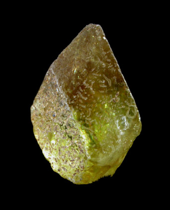 | Description: | Gemmy crystal of yellow titanite, variety sphene. The crystal is so transparent that double-refraction is visible looking through the crystal. |