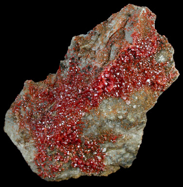 | Description: | Many red crystals of translucent vanadinite coating two sides of matrix. Looks beautiful under magnification - lustrous and colorful. |