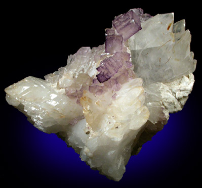 | Description: | Cubic crystals of purple fluorite up to 10 mm overgrown on scalenohedral crystals of colorless calcite up to 30 mm. Nice combination specimen with no apparent damage. |