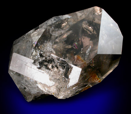 | Description: | Doubly-terminated quartz crystal, variety Herkimer Diamond, with glassy crystal faces and uncommon smoky color caused by sub-microscopic carbon inclusions. One end is remarkably clean. This specimen must be seen in person to be appreciated. |