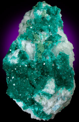 | Description: | Sparkling cluster of bright green dioptase crystals on contrasting white calcite matrix with minor areas of duftite. The dioptase crystals look beautiful under magnification - lustrous and transparent. |