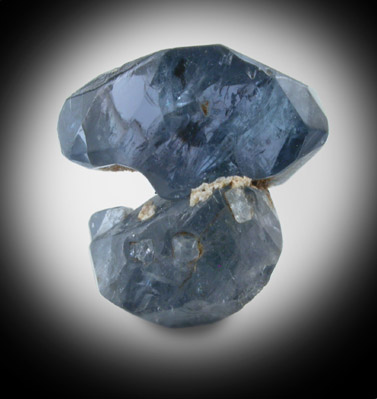 | Description: | Two interconnected crystals of gemmy blue spinel. The crystals have glassy surfaces and have transparent zones. |