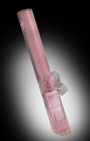 | Description: | Transparent crystal of pink elbaite tourmaline with small lepidolite attached on one side. Though the end is flat, I do not believe it is a termination, but actually a clean break. Mounted in acrylic Perky display box for protection. |