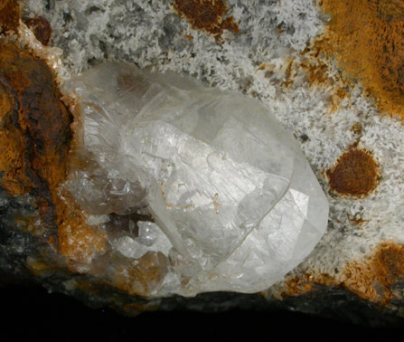 | Description: | Weathered cavity in massive galena matrix with secondary mineralization of colorless anglesite crystals up to 18 mm and botryoidal goethite. The anglesite crystal contacted an adjacent crystal on the lower left, now missing. Amherst specimen markings. Ex. A. Lincoln Sherk II, MD. (1896-1970) |