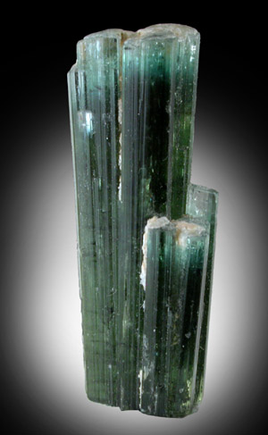 | Description: | Translucent green elbaite tourmaline crystals with a blue zone at the upper end. The terminations are capped with white quartz (or possibly lepidolite). |