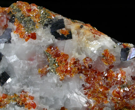 | Description: | Red-orange sphalerite frozen in white calcite matrix with metallic galena. The sphalerite fluoresces bright orange under UV illumination. Ex. Stuart F. Wise collection |