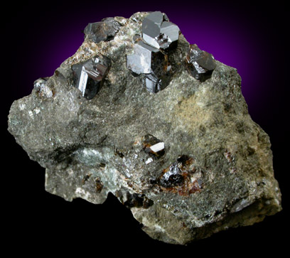 | Description: | Several crystals of brown-black andradite garnet in greenish matrix. Several crystals around the base are incomplete, but a nice group of perfect, lustrous crystals is perched in the upper center of the specimen. Ex. Stuart F. Wise collection #440 |