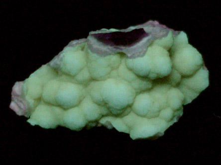 | Description: | White magnesite matrix with a 2 mm thick overgrowth of pale-yellow chalcedony in rounded aggregates up to 7 mm diameter. Fluoresces under UV illumination. Ex. Stuart F. Wise collection |