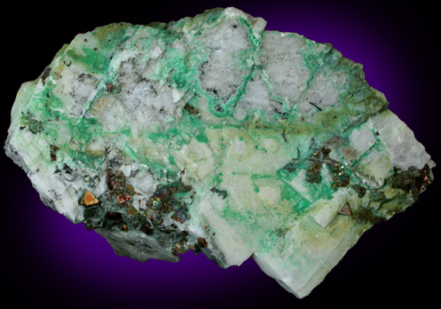 | Description: | White calcite and chalcopyrite matrix with colorful partial coating of bright green malachite microcrystals. When viewed under magnification, hemispherical malachite aggregates are visible. Uncommon copper mineral at this iron mine. Ex. Stuart F. Wise collection #72 |