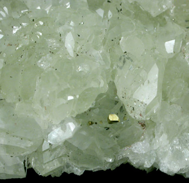 | Description: | Sparkling cluster of mint-green datolite crystals up to 8 mm with pyrite crystals to 1.2 mm. The pyrite crystals are cubic form with octahedral corner modifications. |