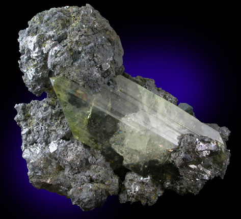 | Description: | Pristine crystal of transparent to translucent yellow anglesite 5 cm long nestled in gray galena matrix. The anglesite crystal is complete and undamaged. |