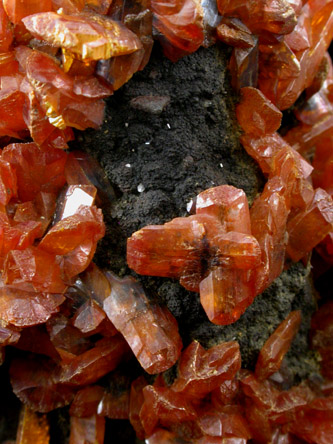 | Description: | Translucent orange orpiment crystals up to 10 mm on dark hutchinsonite matrix. The crystals cover all surfaces around the specimen. Good specimen with minimal imperfections. Ex. John Durkos collection #969 |