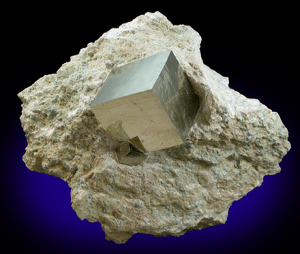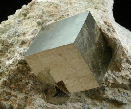 | Description: | Classic specimen of a cubic crystal of pyrite in tan-colored matrix. The pyrite crystal is a near-perfect cube with smooth surfaces. Beginners frequently doubt that these are naturally occurring - they are too perfect. |