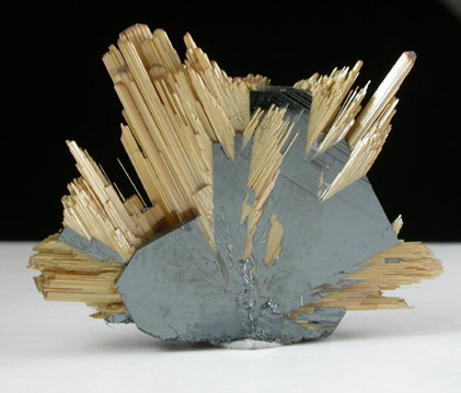 | Description: | Plate of dark metallic hematite crystals with golden, needle-like crystals of rutile epitaxially oriented (at 60 degree angles) on the hematite. |