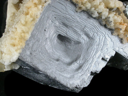 | Description: | Cubic crystal of metallic galena with a partial coating of white calcite on two sides. The galena crystal has a depressed center in the exposed face with terraced crystal patterns. |