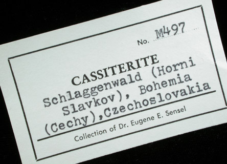 | Description: | Translucent dark brown cassiterite crystals showing complex twinning from the old mines near Schlaggenwald. Good large crystals with excellent translucency. This specimen is illustrated in Rocks and minerals, March-April 2007, page 158. Ex. Dr. Eugene E. Sensel (1911-2000) collection #M497; acquired from R. Hauck in 1987; ex. R. Behnke |
