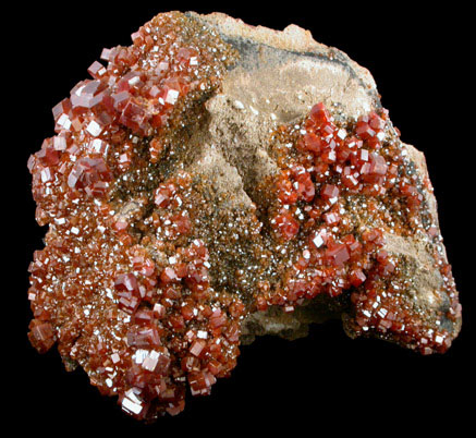 | Description: | Sparkling cluster of red-brown vanadinite crystals covering several surfaces of gossan matrix with minor white barite crystals on one end. The vanadinite crystals have a brilliant luster. Few crystals are missing. |