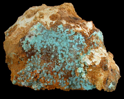 | Description: | Colorful specimen of robin's-egg-blue chalcoalumite lining surfaces on gossan matrix. Looks beautiful under magnification - many lustrous crystals coating the matrix surfaces. |