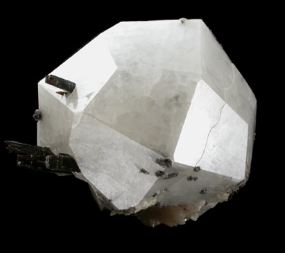 | Description: | Large crystal of white analcime 4 cm across with small black aegirine crystals included in the surface. Good surface luster. The rear has a rectangular notch where it was attached to serandite. Collected December 2003 |