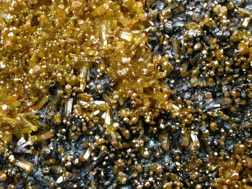 | Description: | Bright yellow mimetite crystals to 2 mm long overgrown on black metallic cesarolite. The cesarolite was identified by Bill Pinch. The crystals look beautiful under magnification: lustrous, transparent with secondary termination faces. |