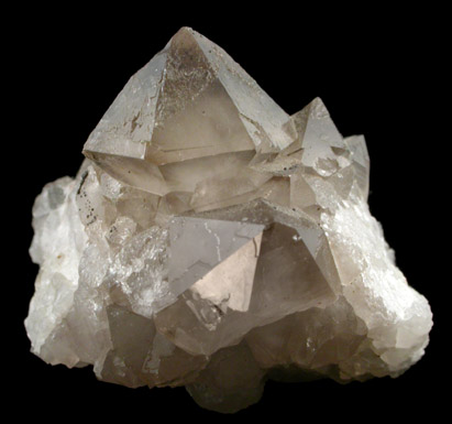 | Description: | Di-pyramidal crystals of smoky quartz in small cluster over colorless quartz. Crystals with this shape are commonly referred to as Cumberland-habit because they commonly occur in Cumberland, England iron mines. |