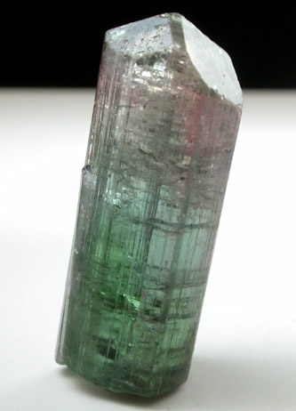 | Description: | Multi-colored crystal of elbaite tourmaline with pyramidal termination. Color varies from green to pink zones. Minor edge wear visible under magnification. |