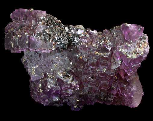 | Description: | Compound crystals of purple fluorite with overgrowth of dark red-brown sphalerite crystals. The fluorite crystals are cubic form with surfaces composed of many smaller, parallel crystal faces. Crystallized front and rear. One corner is cleaved. |