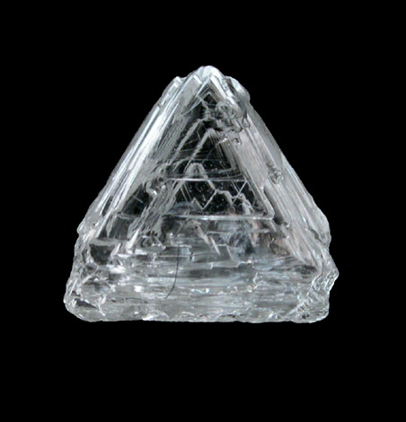 | Description: | Large, colorless, transparent diamond crystal exhibiting Spinel-law twinning (Macle=twin). The external shape is flattened triangle with twin plane visible around the perimeter. |