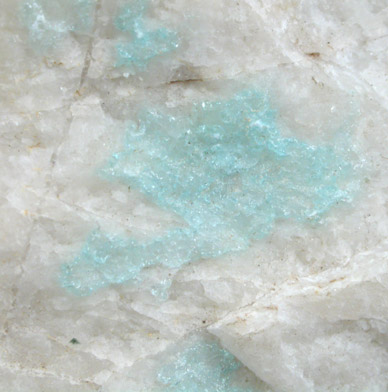 | Description: | Blue patches of hyalite opal on white albite feldspar matrix. The hyalite fluoresces bright green under UV illumination. Hyalite is getting hard to obtain because localities are closed or restricted. Old collection #2839 |