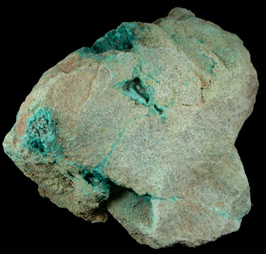 | Description: | Botryoidal blue-green pseudomalachite in small cavities in sandstone matrix. Looks beautiful under magnification. Pseudomalachite is highly sought after from this old mine founded ca. 1715 - the first significant mine in the U.S. Collected in the 1950s by Leonard Miller |