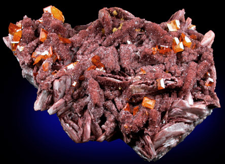 | Description: | Matrix of bladed white-gray barite crystals up to 12 mm with overgrowth of yellow-orange wulfenite crystals up to 5 mm and red-brown translucent microcrystals of another mineral (mimetite? selenite?). Ex. Dr. N. Luppescu |