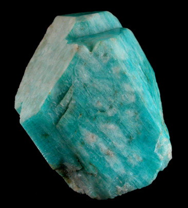 | Description: | Single crystal of microcline feldspar with mottled green color and one face of the termination capped with white albite. The green color is quite rich, typical of this mine. |