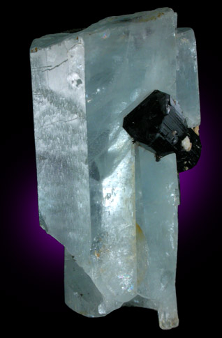 | Description: | Transparent crystal of blue-green aquamarine beryl with an inclusions of black schorl tourmaline. The aquamarine crystal is doubly-terminated and has several hexagonal casts from other schorl crystals, now missing. |