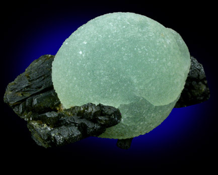 | Description: | Spherical formation of translucent green prehnite with several dark green epidote crystals up to 15 mm included in the base. The prehnite is clean and well formed. All epidote crystals are terminated. |