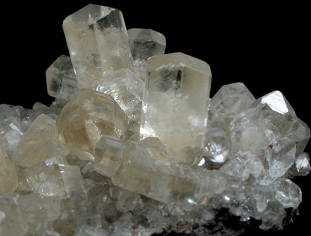 | Description: | Many prismatic crystals of transparent calcite up to 16 mm with small brown sphalerite crystals up to 1 mm on the bottom of the specimen. The calcite crystals hexagonal with three-sided pyramidal terminations. |