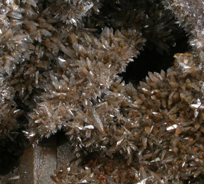 | Description: | Triangular cavity lined with brown scalenohedral calcite crystals. Most of the calcite crystals are 3-5 mm long, but one larger 12 mm crystal is tucked under one side. |