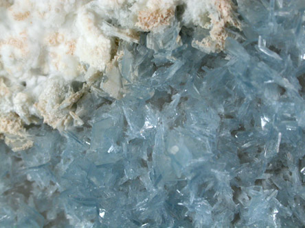 | Description: | Thin bladed crystals of blue barite up to 4 mm with partial overgrowth of a second white mineral (aragonite?) that fluoresces bright green under UV illumination. |
