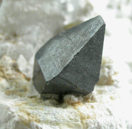 | Description: | Dark blue anatase crystal nestled in white matrix with another anatase crystal on the edge. The anatase is translucent when strongly illuminated (most notable in the thinnest areas). From a new find near the recent brookite discovery of 2005. |