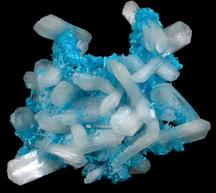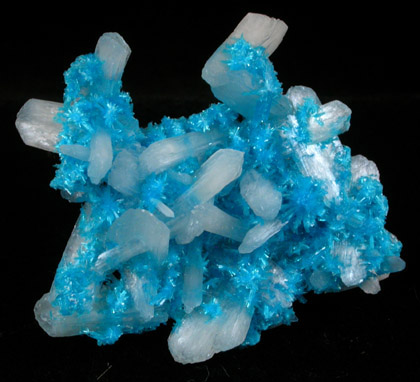 | Description: | Thin crust-like formation of bright blue cavansite crystals up to 3 mm intergrown with colorless stilbite crystals up to 15 mm. When viewed on edge it can be seen that the cavansite is bonding all the stilbite crystals together. Great color, |