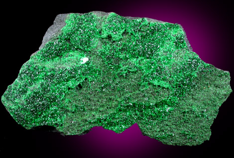| Description: | Excellent specimen of sparkling green uvarovite garnet crystals on a thin plate (sawn) of matrix. Looks beautiful under magnification: transparent, intense emerald-green garnet crystals with glassy crystal faces. |